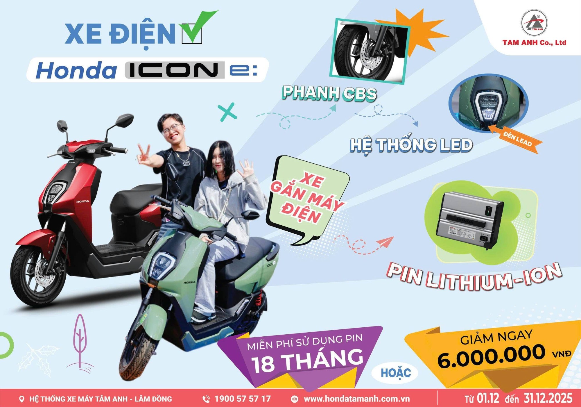 Chương trình áp dụng từ ngày 1/1/2026 tới hết ngày 16/2/2026. Nhanh chân ghé ngay hệ thống HEAD Tâm Anh để trải nghiệm xe điện ICON e: và nhận ngay quà tặng hấp dẫn trong dịp khuyến mãi này nhé!
