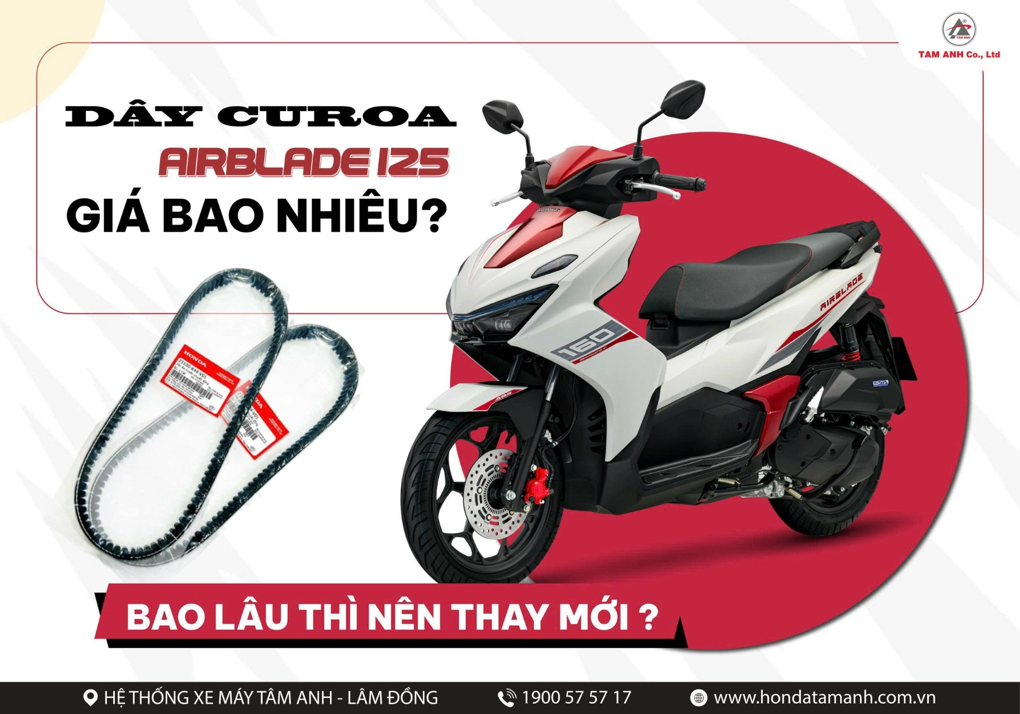 Dây curoa airblade 125 bao lâu thì nên thay mới? Đối với Air Blade 125 cũng như hầu hết các dòng xe tay ga hiện nay, dây curoa là bộ phận giữ vai trò vô cùng quan trọng, ảnh hưởng trực tiếp đến khả năng truyền động và vận hành của xe. Vì vậy, dây curoa cần được kiểm tra và bảo dưỡng định kỳ để đảm bảo xe luôn chạy êm, bốc và an toàn. Tuy nhiên, trên thực tế nhiều người dùng vẫn chưa thực sự quan tâm đến bộ phận này, dẫn đến tình trạng dây curoa xuống cấp nhưng không được thay kịp thời. Vậy dây curoa xe Air Blade 125 bao lâu thì nên thay và chi phí bao nhiêu? Cùng HEAD Tâm Anh tìm hiểu chi tiết ngay bên dưới để chủ động chăm sóc xe tốt hơn nhé!